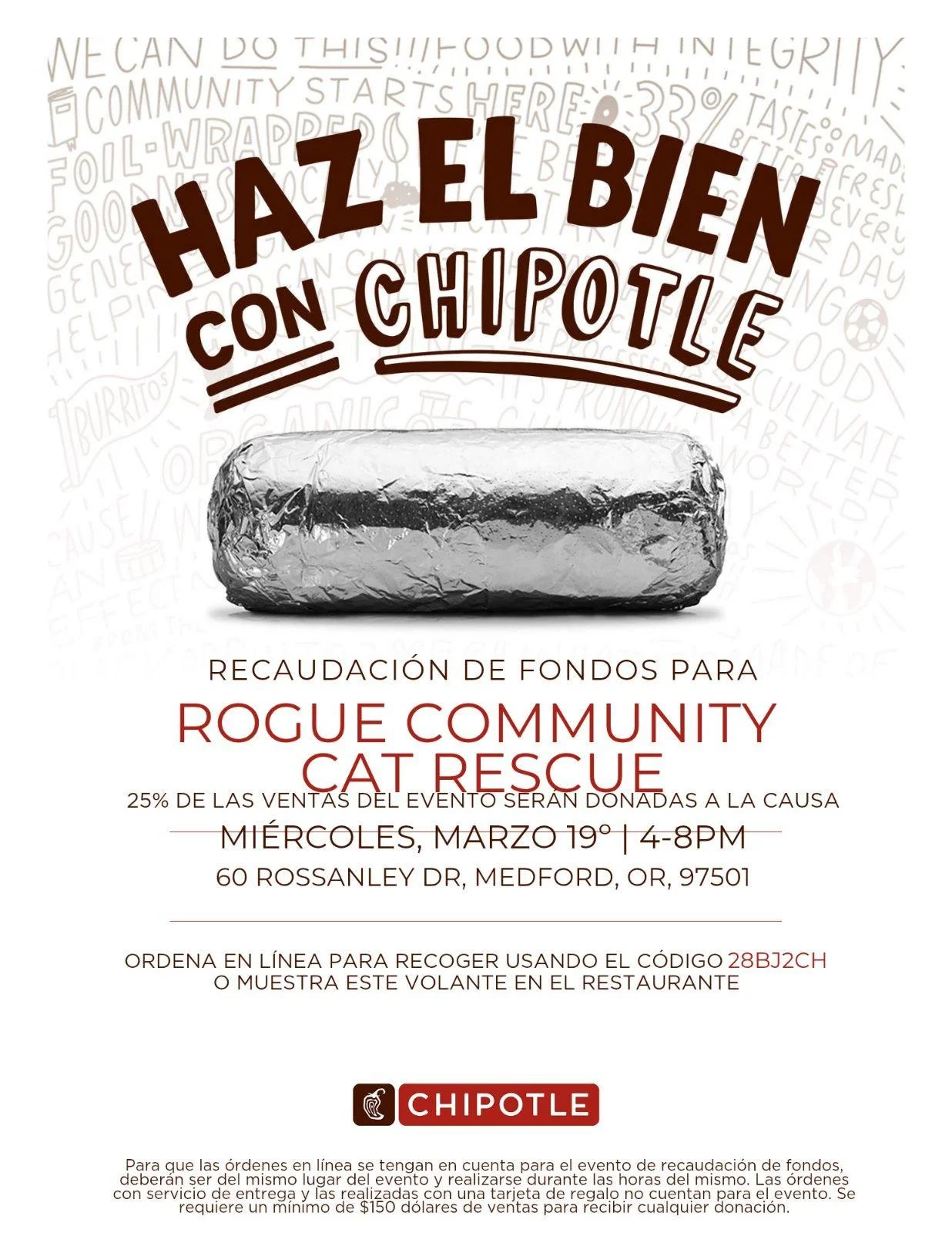Grab a bite to eat at Chipotle and support a good cause! 25% of sales during this event will be donated to Rogue Community Cat Rescue. Be sure to show the flyer below during check out.