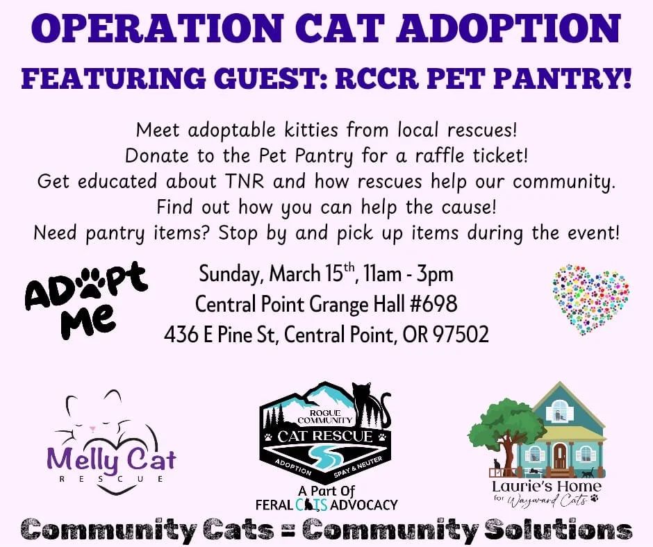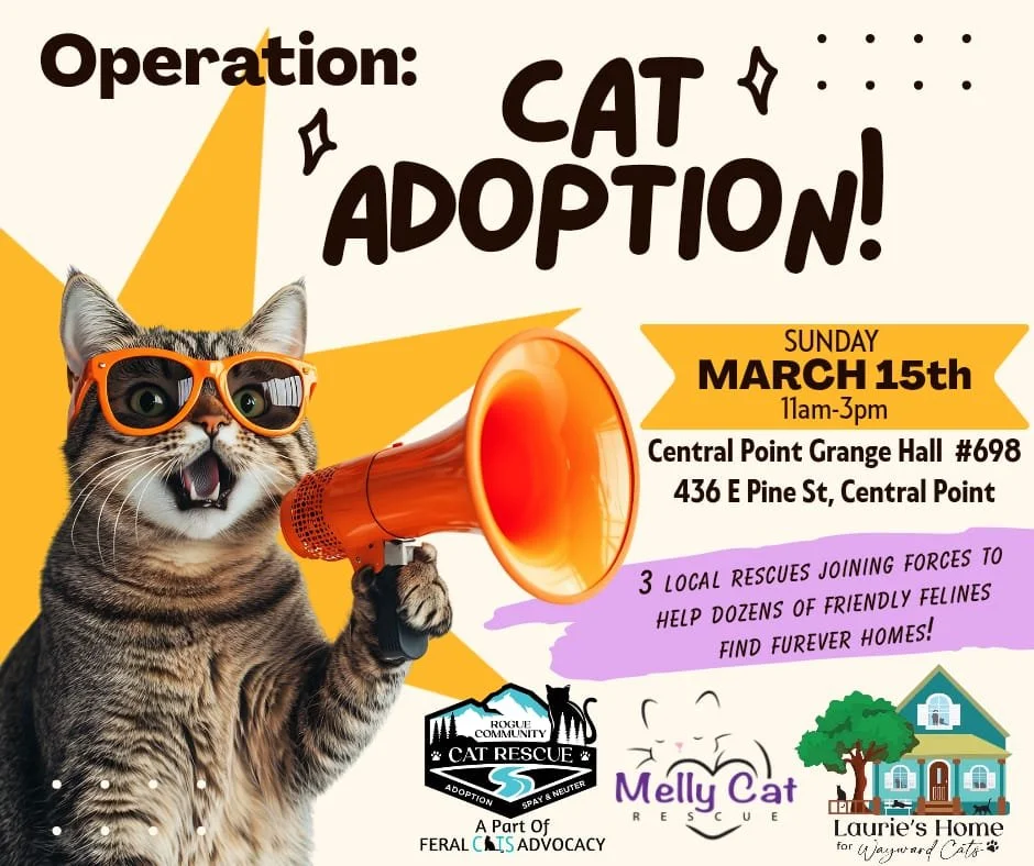 Operation: Cat Adoption is a partnership to help find purrfect homes for cats and kittens in our community. Up to three rescue organizations will be participating, including Rogue Community Cat Rescue (RCCR), so you’ll be able to visit with many adoptable felines from around the Rogue Valley!