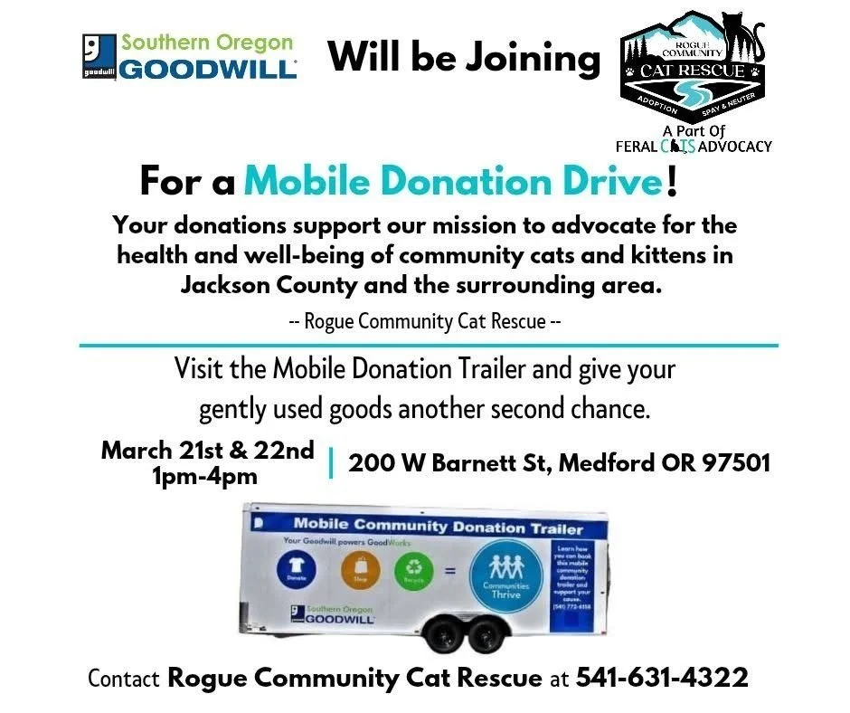 Ready for Spring cleaning? Help us raise needed funds for Rogue Community Cat Rescue by donating your unwanted items to help us fill the Goodwill donation trailer. Drop-offs will be accepted Saturday and Sunday between 1-4 pm at our building in Medford.