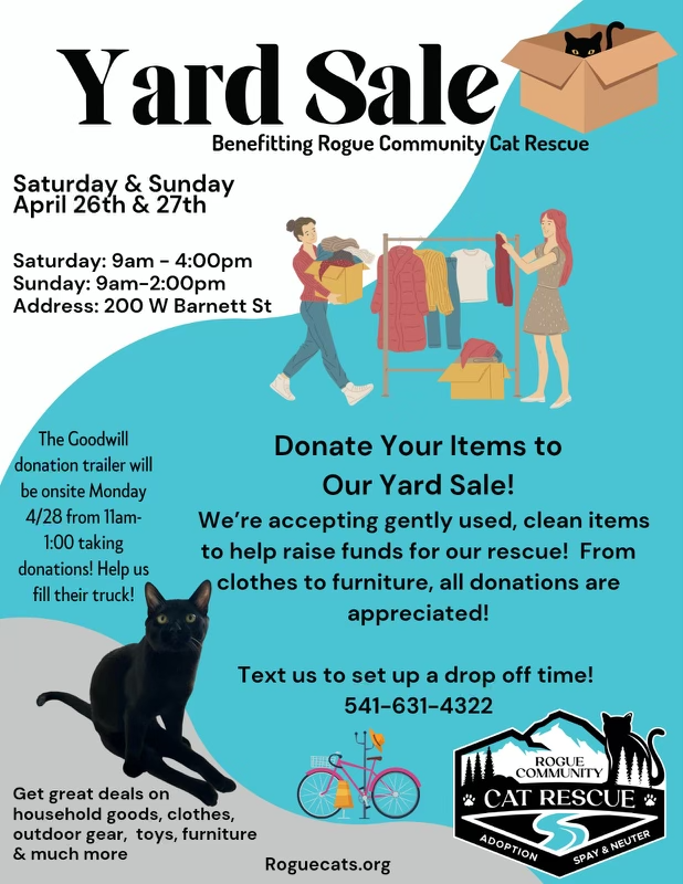 Join us for a yard sale benefitting Rogue Community Cat Rescue. Get great deals on household goods, clothes, outdoor gear, toys, furniture, and much more!