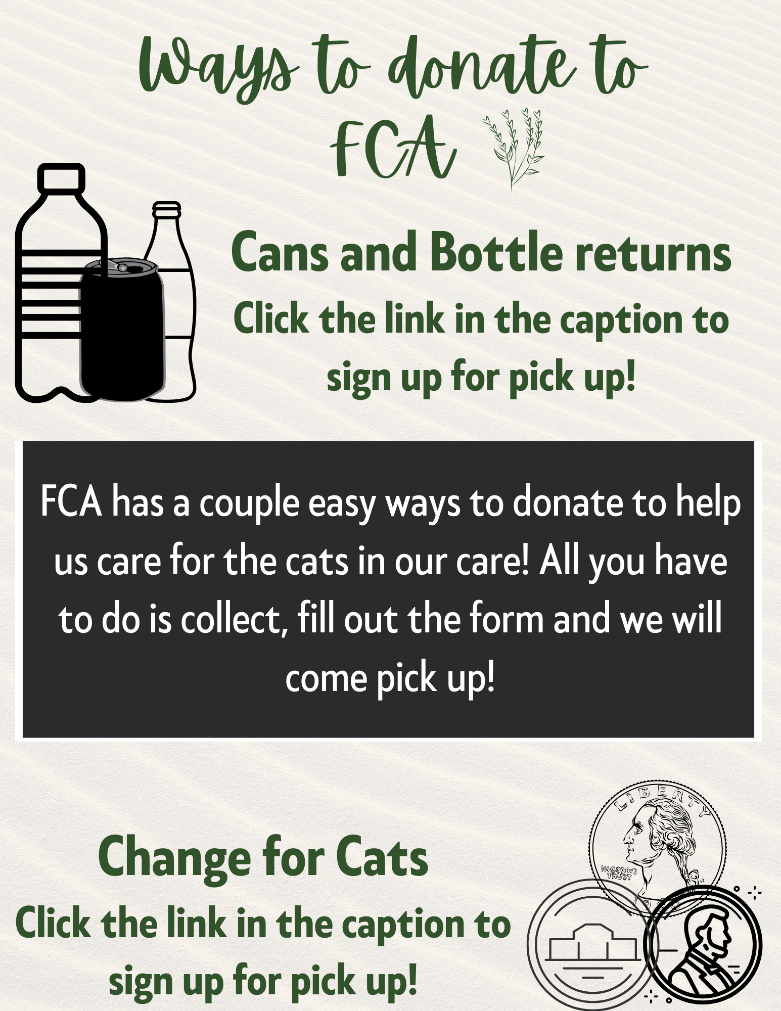 Do you have a change jar or car cup holder overflowing with coins you’d like to donate? Simply fill out the Change for Cats Form and we will come pick up!